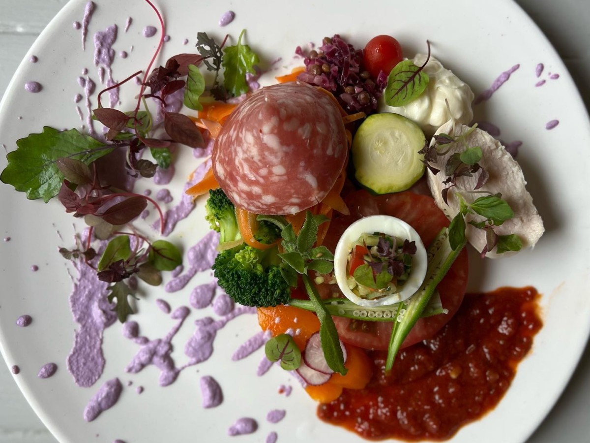 本日は黄色と紫と🥦緑の野菜を使用しました♪野菜のアクセントは小松菜と茄子のソース️!