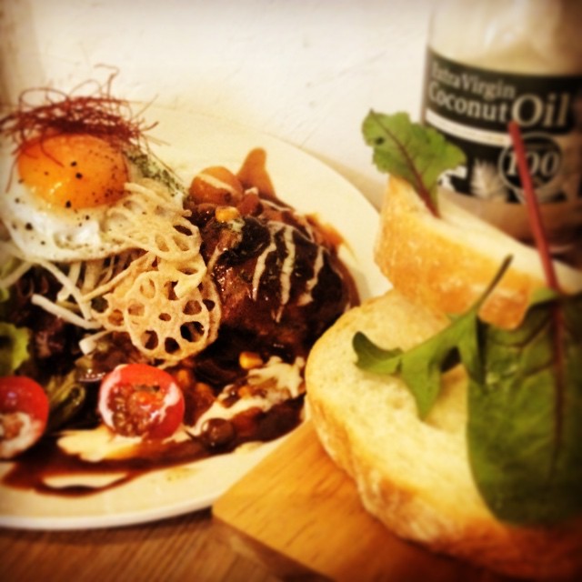 MAHALOのリゾートごはんロコモコハワイアンサラダと超BIGバケッドココナッツオイルを塗って #MAHALO#マハロ#カフェ#cafe#ロコモコ#ハワイアン#ハワイ#hawaii#ハンバーグ#目玉焼き#サラダ#無農薬#野菜#バケッド#ココナッツオイル#ミランダカー#ココナッツ#coconut#coconutoil美容#resort#リゾート#instafood #instagood #food #cook #love #l4l #f4f #follow