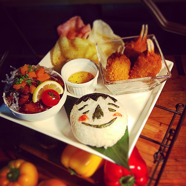 今日のマハロご飯。ズワイ蟹のすり身フライ~国産蜂蜜につけて~、鳥もものアジアンソースあえ、サクサクエビセン、ニコチャン明太コーンおにぎり。#マハロ #プレート #ニコチャン #カニ #カフェ #蜂蜜 #cook #instagood #instafood #food #f4f #l4l