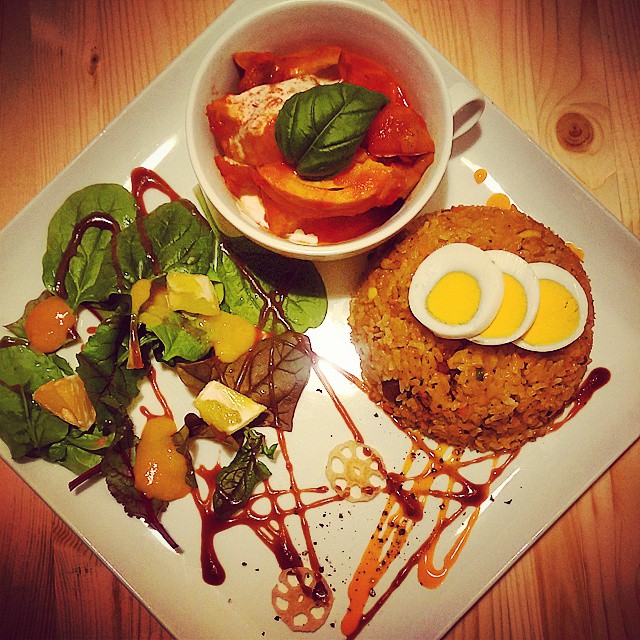夜カフェごはん。本日は、プレートです。糸島無農薬野菜と自家製みかんソース&バルサミコソースがけ。じっくりトマト煮込みインローストチキン。なめ茸焼き飯。#マハロ #cook #カフェ #夜カフェ #instagood #instafood #無農薬 #love #l4l